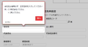 この課題を解決するため、NAVIGOを導入。画面上で操作手順を順番にナビ表示するだけでなく、入力に迷いやすい箇所には具体例や注意点も表示されます。例えば、会社名は「正式名称」、電話番号は「ハイフン不要」、住所は「番地や建物名まで正確に入力」、といったナビがあることで、社員は迷わず正確に作業を進められます。